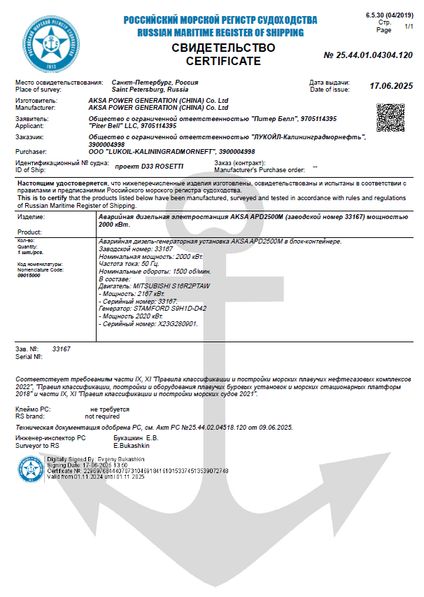 Дизельная электростанция Питер Белл номинальной мощностью 2000 кВт на базе двигателя Mitsubishi, напряжением 6 кВ, контейнерного исполнения с свидетельством РМРС (Российского морского регистра судоходства).