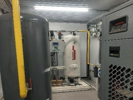 Автоматизированная компрессорная станция блочно-модульного типа, предназначена для снабжения объектов газовой инфраструктуры сжатым воздухом и азотом с рабочим давлением 11 бар. Станция выполнена на базе винтового компрессора Tidy20B-10-500D и генератора азота DGN 500 (производительностью 108 нм. куб /час, чистота выработанного азота 95-99,999 %). Станция оборудована необходимыми системами, обеспечивающими автоматическую работу без присутствия обслуживающего персонала.